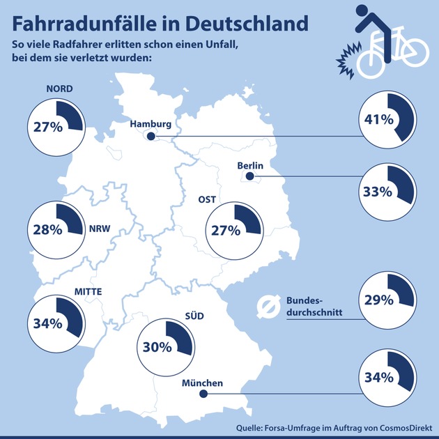 Eine Autotür, die plötzlich aufgestoßen wird, ein Hindernis auf dem Weg - schnell ist es passiert: 53 Prozent der Radfahrer in Deutschland hatten bereits einmal einen Unfall mit dem Fahrrad und 29 Prozent der Betroffenen haben sich dabei verletzt. Das ergab jetzt eine repräsentative forsa-Studie im Auftrag von CosmosDirekt.(1) In der Mitte (34 Prozent) und im Süden Deutschlands (30 Prozent) liegen die Radunfälle mit Verletzungen sogar über dem Bundesdurchschnitt. Unter Deutschlands Metropolen sticht besonders Hamburg hervor: Hier haben 41 Prozent der Fahrradfahrer bereits einen Unfall erlitten, bei dem sie sich eine Verletzung zugezogen haben.