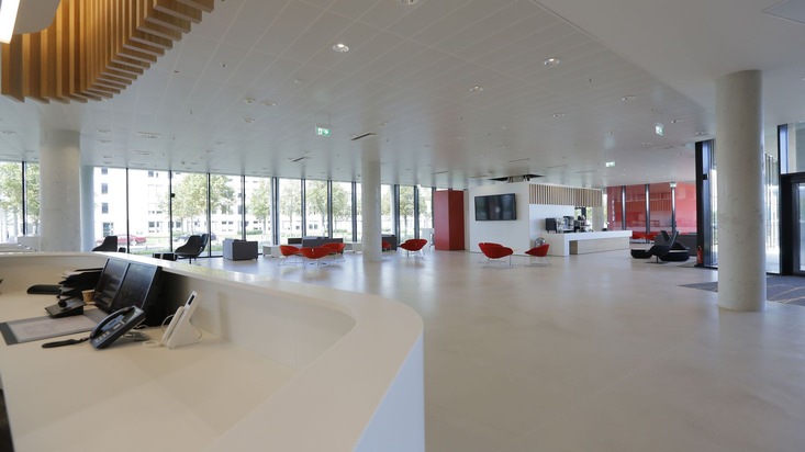 Nach einer rund zweijährigen Bauzeit ist das neue Santander-Gebäude an der Madrider Straße im Nordpark jetzt termingerecht bezugsfertig. Ende vergangener Woche sind bereits die ersten 50 Mitarbeiterinnen und Mitarbeiter in den neuen Bürokomplex eingezogen. Der erste Umzug ist auch ein Probelauf, um einen einwandfreien Betrieb sicherzustellen. Im Laufe des vierten Quartals dieses Jahres beziehen dann die weiteren rund 1450 Mitarbeiter den Neubau.