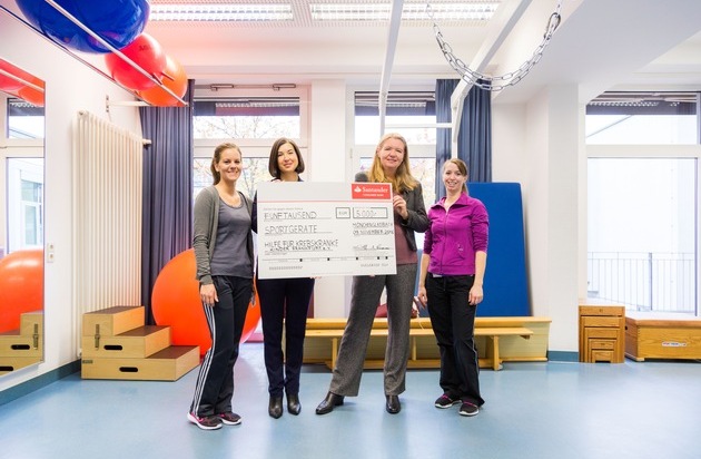 "Mit den 5 000 Euro können wir neue Sportgeräte anschaffen und so die Kraft und das Durchhaltevermögen der jungen Patienten mit einer gezielten Bewegungstherapie verbessern", freut sich Karin Reinhold-Kranz über die Spende von Santander. Seit Januar 2015 können Kinder und Jugendliche in der Kinderkrebsklinik in Frankfurt an einem sporttherapeutischen Programm während der Chemotherapie, Strahlentherapie und Stammzelltransplantation teilnehmen. Die gezielte Bewegungsförderung unterstützt nachweislich den Heilungsprozess, körperlich wie auch psychisch. Die Kosten für dieses Projekt trägt der Verein "Hilfe für krebskranke Kinder Frankfurt e.V.".
