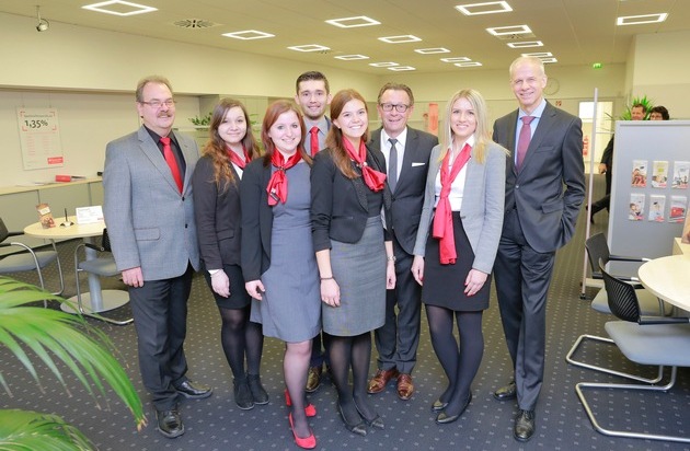 - Fünfköpfiges Azubi-Team koordiniert eigenständig BankgeschäfteFünf angehende Bankkaufleute aus verschiedenen Filialen der Santander Consumer Bank und der Santander Bank, einer Zweigniederlassung der Santander Consumer Bank AG, leiten für eine Woche die Filiale der Santander Consumer Bank in Oberhausen. Vom 28. November bis zum 2. Dezember 2016 übernehmen die Auszubildenden eigenverantwortlich alle Aufgaben und Tätigkeiten der Bankfiliale in der Marktstraße. Ulrich Leuschner, Vorstandsvorsitzender der Santander Consumer Bank AG, besuchte jetzt die Azubi-Filiale, um sich vor Ort einen persönlichen Eindruck vom Leistungs- und Ausbildungsstand seiner jungen Mitarbeiter zu machen.