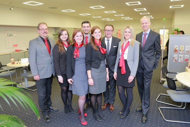 - Fünfköpfiges Azubi-Team koordiniert eigenständig BankgeschäfteFünf angehende Bankkaufleute aus verschiedenen Filialen der Santander Consumer Bank und der Santander Bank, einer Zweigniederlassung der Santander Consumer Bank AG, leiten für eine Woche die Filiale der Santander Consumer Bank in Oberhausen. Vom 28. November bis zum 2. Dezember 2016 übernehmen die Auszubildenden eigenverantwortlich alle Aufgaben und Tätigkeiten der Bankfiliale in der Marktstraße. Ulrich Leuschner, Vorstandsvorsitzender der Santander Consumer Bank AG, besuchte jetzt die Azubi-Filiale, um sich vor Ort einen persönlichen Eindruck vom Leistungs- und Ausbildungsstand seiner jungen Mitarbeiter zu machen.