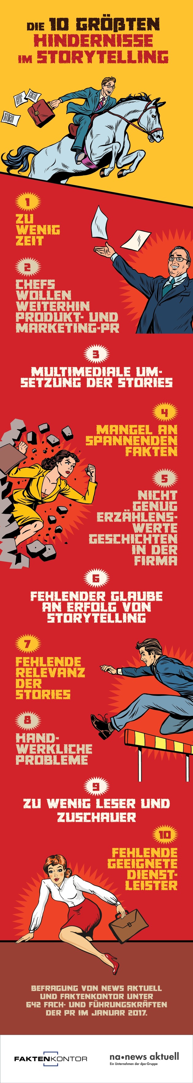 Storytelling ist ein wichtiges Mittel in der PR. Doch oft klappt die Umsetzung nicht. Woran liegt das? Antwort: Den meisten PR-Verantwortlichen fehlt schlicht und einfach die Zeit, um gute Stories zu entwickeln. Zu diesem Ergebnis kommt der aktuelle PR-Trendmonitor von news aktuell und Faktenkontor. An zweiter Stelle nennen die Umfrageteilnehmer die mangelnde Unterstützung der Geschäftsführung: So fordern viele Chefs weiterhin eine Produkt getriebene PR. Schwierigkeiten macht den PR-Profis außerdem die multimediale Umsetzung der Geschichten. An der Befragung haben 642 Kommunikationsfachleute aus Unternehmen und PR-Agenturen teilgenommen.