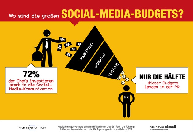 Für die deutschen Unternehmenslenker ist die Social-Media-Kommunikation ein sehr wichtiger Investitionsschwerpunkt. Aber nur die Hälfte dieser Gelder landet am Ende tatsächlich bei der PR. Das ergab eine gemeinsame Befragung der dpa-Tochter news aktuell und Faktenkontor. 567 Topmanager und PR-Verantwortliche gaben Auskunft über die Investitionsbereitschaft ihrer Unternehmen in Social Media.