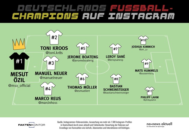 Welcher deutsche Fußballspieler ist aktuell auf Instagram am erfolgreichsten? Den ersten Platz sichert sich Mesut Özil vom FC Arsenal (Stand: 25. Juni 2018). Ihm folgen Toni Kroos (Real Madrid) und Manuel Neuer (Bayern München). Die dpa-Tochter news aktuell und Faktenkontor haben ausgewertet, welche deutschen Fußballspieler die höchste Relevanz auf der Foto-Plattform haben. Die Analyse basiert auf dem Instagrammer-Relevanzindex von Faktenkontor. Datenbasis sind rund 1.500 deutsche Instagram-Profile.