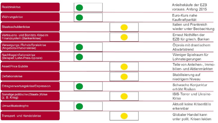 - Krisenampel liefert weiter Warnsignale für 6 von 12 Krisentypen - Ölpreis und schwache Konjunktur erhöhen Deflationsrisiko - EZB offenbar kurz vor Start eines Anleiheankauf-Programms