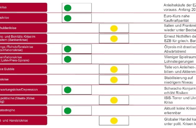 - Krisenampel liefert weiter Warnsignale für 6 von 12 Krisentypen - Ölpreis und schwache Konjunktur erhöhen Deflationsrisiko - EZB offenbar kurz vor Start eines Anleiheankauf-Programms