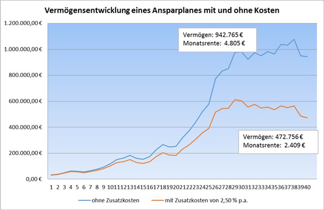 siehe Grafik "Vermögensentwicklung eines Ansparplanes mit und ohne Kosten"