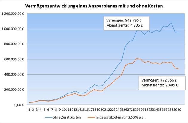siehe Grafik "Vermögensentwicklung eines Ansparplanes mit und ohne Kosten"