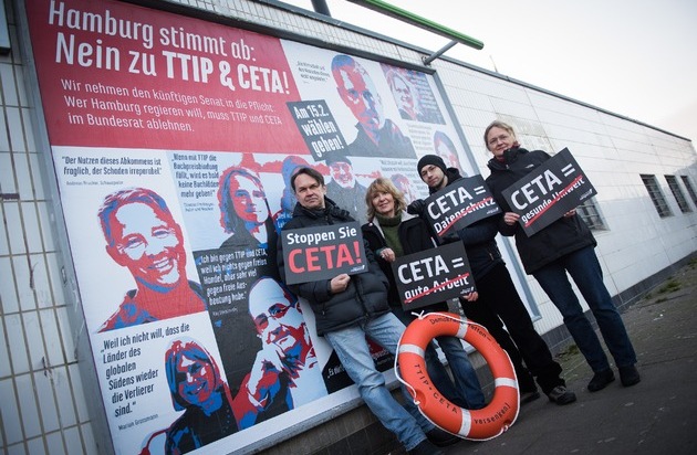 Zwölf Tage vor der Bürgerschaftswahl macht die Bürgerbewegung Campact die umstrittenen Abkommen TTIP und CETA mit den USA und Kanada zum Thema des Hamburger Wahlkampfs. Tausende Hamburger haben über 410 000 "Denk-Zettel" bestellt, um sie am Tag vor der Wahl an Wohnungstüren in ihrer Nachbarschaft zu hängen. Damit wird ein Großteil aller Hamburger Haushalte erreicht.