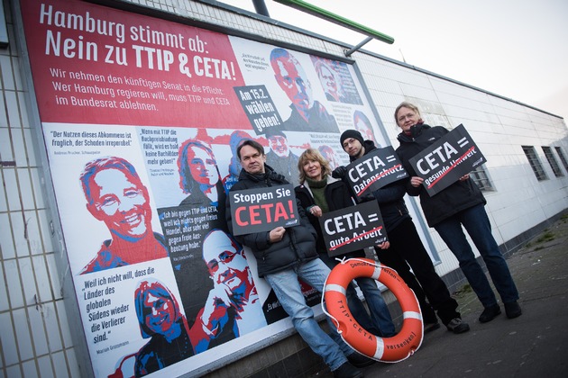 Zwölf Tage vor der Bürgerschaftswahl macht die Bürgerbewegung Campact die umstrittenen Abkommen TTIP und CETA mit den USA und Kanada zum Thema des Hamburger Wahlkampfs. Tausende Hamburger haben über 410 000 "Denk-Zettel" bestellt, um sie am Tag vor der Wahl an Wohnungstüren in ihrer Nachbarschaft zu hängen. Damit wird ein Großteil aller Hamburger Haushalte erreicht.