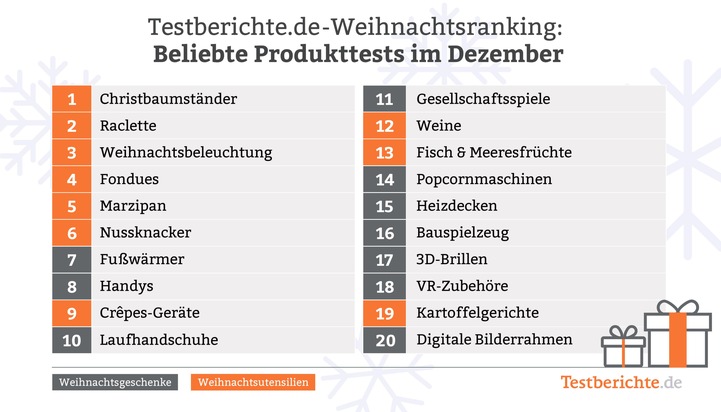 Das Verbraucherportal Testberichte.de (www.testberichte.de) hat untersucht, welche Produkttests besonders im Weihnachtsmonat Dezember auf starkes Nutzerinteresse stoßen.