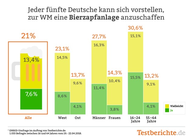 EMNID-Umfrage im Auftrag von Testberichte.de: Jeder fünfte Deutsche überlegt, zur WM eine Bierzapfanlage anzuschaffen