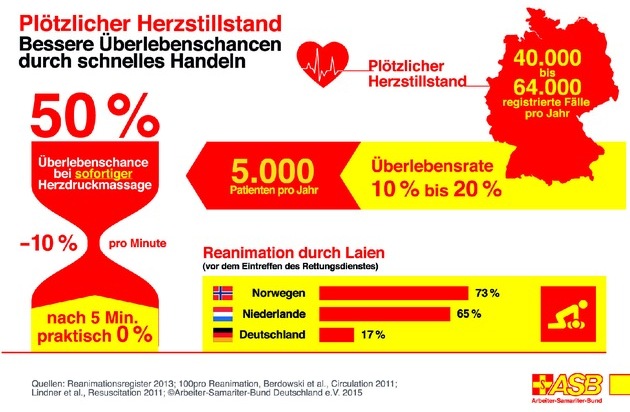 "Die kürzeren und kompakteren Kurse sollen mehr Menschen dazu motivieren, ihre Erste-Hilfe-Kenntnisse aufzufrischen", betont Christian Kamp, Referent für Notfallausbildung beim Arbeiter-Samariter-Bund (ASB). Dies ist auch nötig, denn in Deutschland leisten im Ernstfall zu wenige Menschen Erste Hilfe. Bricht hier auf offener Straße ein Mensch mit plötzlichem Herzstillstand zusammen, starten nur 17 Prozent der Umstehenden eine Herzdruckmassage. In den Niederlanden beträgt die Rate der Laien, die bis zum Eintreffen des Rettungsdienstes reanimieren, hingegen 65 Prozent.