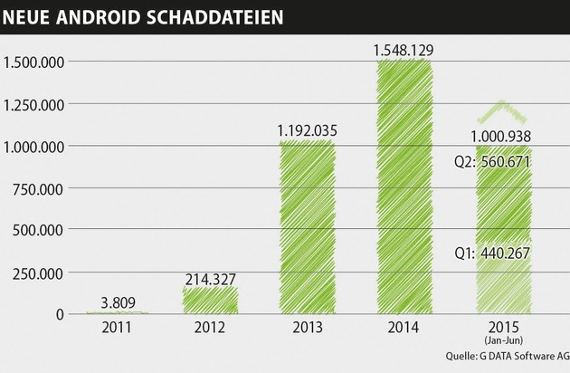 Im zweiten Quartal 2015 analysierten die Experten täglich über 6.100 neue Android-Schaddateien. Zum Vergleich: Im ersten Quartal 2015 waren es knapp 4.900 Schad-Apps. Das bedeutet einen Anstieg um knapp 25 Prozent. Bereits jetzt bricht das erste Halbjahr alle bisherigen Schadcode-Rekorde: über eine Million neuer Android-Malware (1.000.938) innerhalb von nur sechs Monaten. Damit haben die Analysten im ersten Halbjahr bereits fast so viele Android-Schaddateien entdeckt wie im gesamten Jahr 2013. G DATA geht bis Jahresende von über zwei Millionen neuen Schad-Apps aus.