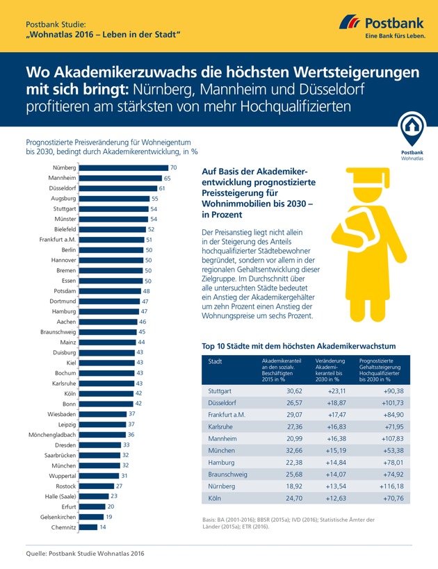 Die Postbank Studie "Wohnatlas 2016 - Leben in der Stadt" wurde unter der Leitung von Michael Bräuninger, Professor an der Helmut-Schmidt-Universität und Experte für Economic Trends Research, durchgeführt. Analysiert wurden die 30 größten deutschen Städte sowie sechs Städte, die jeweils die größten eines Bundeslandes sind und nicht zu den Top 30 gehören. Im Fokus der vorliegenden Analyse steht die Entwicklung der Kaufpreise für Wohneigentum in Relation zum Akademikeranteil und der Einkommensentwicklung bei Hochqualifizierten. Für eine Prognose wurde die Entwicklung der Jahre 2000 bis 2015 analysiert und bis 2030 fortgeschrieben.
