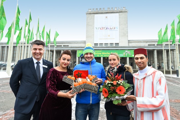 Der Landsberger Landwirt Johannes Geier ist der 100.000. Besucher der Internationalen Grünen Woche 2016. Der 32-Jährige ist extra aus Oberbayern für die Messe angereist, und weil es sein erster Besuch überhaupt ist, will er sich "überraschen lassen, was es hier alles gibt". Seine Begleiterin Julia Schwägerl, Bürokauffrau aus München, war dagegen schon öfter auf der Grünen Woche. Mindestens ein gemeinsames Interesse haben sie: "Ernährungsfragen, also auch einfach Essen und Bier." Aus dem Partnerland Marokko gab es einen Präsentkorb in Form des Sterns, der auch die Landesflagge schmückt. Er enthielt neben Mandarinen typisch marokkanische Essenzen, die zur Verfeinerung von Speisen ebenso wie von Kosmetik verwendet werden: Nussiges Arganöl, Orangenblütenwasser, Rosenwasser und Olivenöl.
