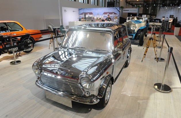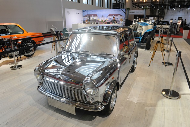 1999 feierte der Mini seinen 40. Geburtstag. Aus diesem Anlass lud das Unternehmen 1998 verschiedene Künstler ein, ihren eigenen "Designer Mini" zu gestalten. David Bowies Kunstwerk - selbst die Scheiben sind verchromt und damit (von außen) undurchsichtig - ist sicherlich der spektakulärste der Künstler-Serie. Die ganze Welt sollte sich darin spiegeln, das Fahrzeug fortan nicht ohne sein Umfeld betrachtet werden - so die Intention der weltberühmten Pop- und Künstlerikone. Aussteller: BMW Group Classics, Ausstellungsort: Boulevard, Halle 20