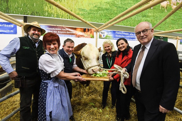 Heute ist der große Tag von Ex Machina. Der 1620 kg schwere Fleckviehbulle feiert seinen 8. Geburtstag auf der Grünen Woche. Kein geringerer als der Vorsitzende der CDU/CSU-Bundestagsfraktion, Volker Kauder, und seine stellvertretende Vorsitzende, Gitta Connemann, überbrachten dem stattlichen Tier, das im Besitz der Bayerngenitk GmbH ist, die Glückwünsche der Messe und Pfleger. Als Geburtstagsgeschenk reichten ihm die Politiker einen frischgrünen Kohlkopf gefüllt mit schmackhaftem Kraftfutter. In seinem früheren Leben war Ex Machina ein sogenannter Besamungsbulle, dessen Spermien für die Tierzucht gewonnen wurden. Heute ist der rüstige "Herr" pensioniert und lebt auf seinem "Altersitz" in Franken.