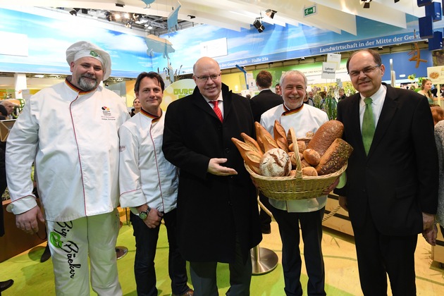 Am heutigen Freitag besuchte Peter Altmaier, Bundesminister für besondere Aufgaben und Chef des Bundeskanzleramts, die Grüne Woche. Er wurde vom Bundesminister für Ernährung und Landwirtschaft, Christian Schmidt, begleitet. "Die Grüne Woche ist der Inbegriff der Landwirtschaft und ein enormer Sympathieträger, der einher geht mit Lebensqualität. Das kann kein anderer Standort", fasste der Kanzleramtsminister seine Eindrücke zusammen. Landwirtschaftsminister Schmidt: "Die Grüne Woche wird immer internationaler. Noch nie habe ich so viele internationale Landwirtschaftsdelegationen in Berlin gesehen. Die Grüne Woche ist der Nabel der Welt." In der BMEL-Halle erfuhren die Besucher, dass die beiden Minister eine kulinarische Vergangenheit teilen: Altmaier hatte Christian Schmidt schon bekocht, bevor er Landwirtschaftsminister wurde. "Das hat ihm die Kraft fürs Amt gegeben", scherzte der Kanzleramtsminister. Schmidt gab das Kompliment zurück, indem er seinem Amtskollegen einen feinen saarländischen Geschmackssinn bescheinigte.