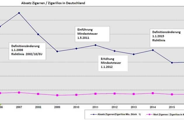 Bodo Mehrlein, Geschäftsführer vom Bundesverband der Zigarrenindustrie (BdZ), weist darauf hin, dass sich der Absatz von Zigarren und Zigarillos in den letzten Jahren durch verschiedene finanzpolitische Maßnahmen wie die Einführung der Mindeststeuer und die Änderung der Produktdefinition auf ein vernünftiges Maß reduziert hat. Die Absatzzahlen aus dem Jahre 2007 haben sich mehr als halbiert.