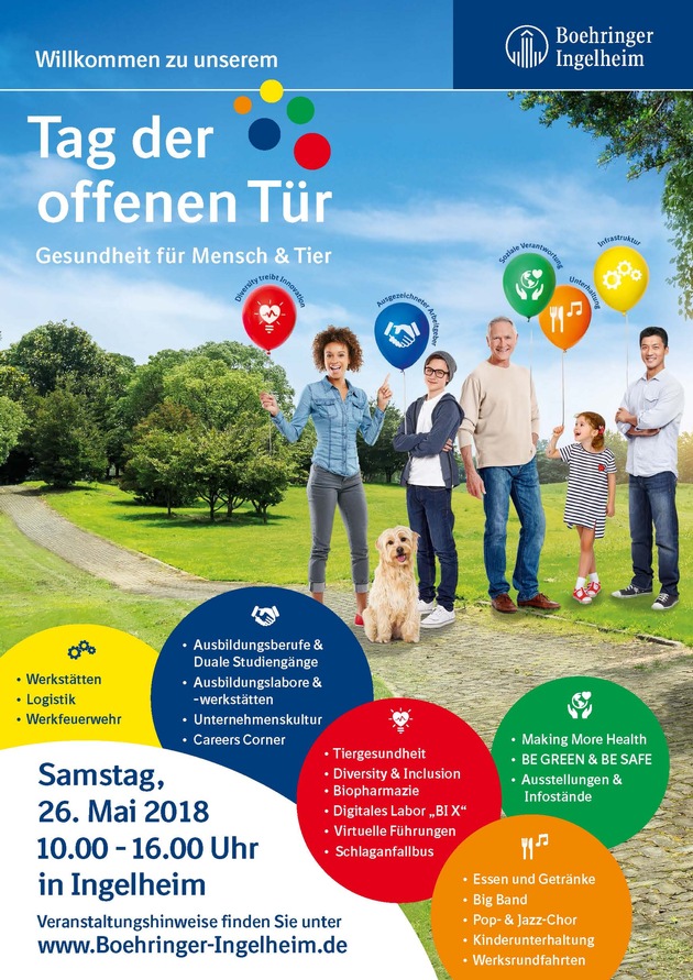Unter dem Motto "Gesundheit für Mensch und Tier" richtet das forschende Pharmaunternehmen Boehringer Ingelheim am Samstag, den 26. Mai, seinen "Tag der offenen Tür" am Standort Ingelheim aus. Die Veranstaltung bietet Besuchern von 10.00 bis 16.00 Uhr einen Einblick in das Werksgelände und die verschiedenen Geschäftsbereiche des Unternehmens. Zudem erwartet die Gäste ein vielfältiges Programm für die ganze Familie.