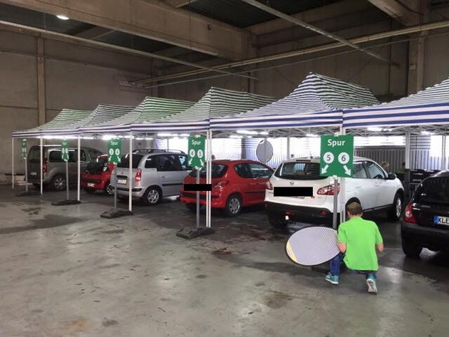 Die Standorte für die Sammelbesichtigungen sind nach folgendem Drive-in-Prinzip konzipiert: Für jeden Sachverständigen ist eine Spur eingerichtet, auf der die Kunden ihre Fahrzeuge zur Besichtigung vorführen. Pro Woche werden aktuell rund 800 Fahrzeugen bei den Sammelaktionen begutachtet.