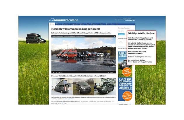 Bei den Communities entfielen die meisten Stimmen (932) auf die Ford Transit Nugget-Community www.nuggetforum.de. Geschlagen geben mussten sich für dieses Mal der Facebook-Auftritt des Ford Focus RS Forum (https://www.facebook.com/pages/Focus-RS-Forum/150613351656466) mit 399 Stimmen, die Schweizer Ford Tuning Events (https://www.facebook.com/FoCuZz.Ch, 279 Stimmen), die Tuning-Plattform Fiesta-Ka-Forum (https://www.fiesta-ka-forum.de, 212 Stimmen) sowie die Ford Bilder Galerie (https://m.facebook.com/groups/125929487527697, 174 Stimmen). Insgesamt stimmten in dieser Kategorie die meisten Internet-User (1996 Stimmen) ab.