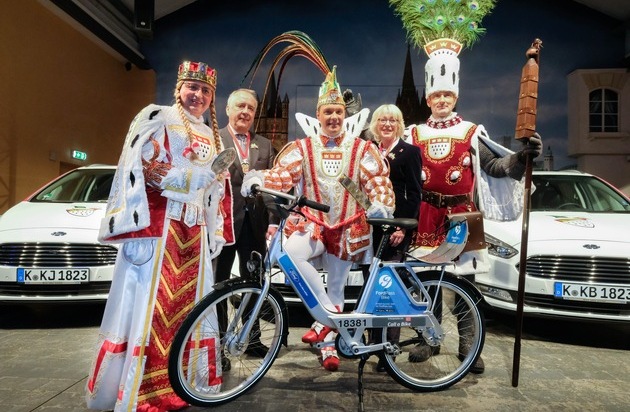 Das Dreigestirn, das in diesem Jahr die Karnevalsgesellschaft "Nippeser Bürgerwehr 1903 e.V." stellt, ist in den nächsten Wochen also im Ford Galaxy unterwegs - passend zu den Kölner Karnevalsfarben rot-weiß lackiert. Und falls Prinz Michael II., Bauer Christoph und Jungfrau Emma mal im dichten Kölner Verkehr stecken bleiben sollten, können sie nun auch ganz spontan auf zwei Räder umsteigen.Gunnar Herrmann überreichte ihnen außer den Wagenschlüsseln auch Gutscheine für eine einjährige Mitgliedschaft bei FordPass Bike, dem Bikesharing-System, mit dem Ford zusammen mit der Deutschen Bahn Connect 2000 Leihfahrräder in Köln anbietet. Ford macht den Kölner Karneval wieder mobil, diesmal auf vier und auf zwei Rädern.
