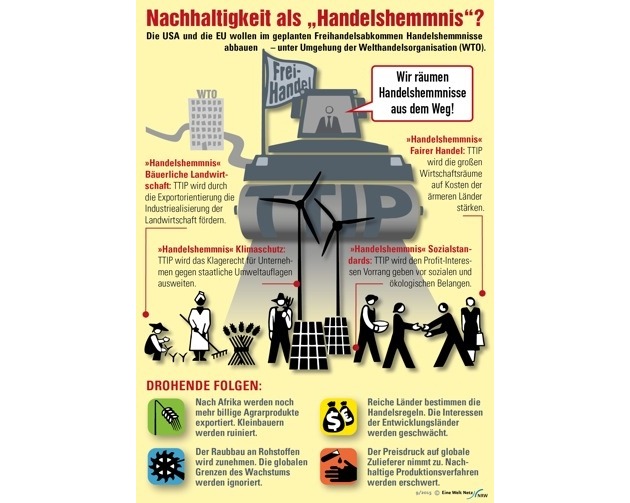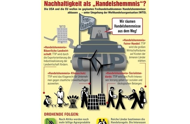 Entwicklungspolitische Organisationen empört bei TTIP vor allem, dass Maßnahmen für globale Nachhaltigkeit von Lobbyisten als Handelshemmnisse definiert werden. Die Verhandlungen zwischen den USA und der Europäischen Union zu TTIP werden abseits der Welthandelsorganisation WTO geführt, um keine Rücksicht auf die Interessen der Entwicklungsländer nehmen zu müssen. Doch Kleinbauern droht der Ruin, wenn z.B. noch mehr billige Agrarprodukte nach Afrika exportiert werden.