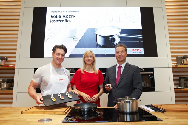Gekocht wurde ganz im Stil von "The Taste", der beliebten Kochshow in SAT.1, die zum Start der neuen Staffel am 2. September 2015 exklusiv mit Bosch im Bereich der Hausgeräte kooperiert. Anschließend konnten die Pressevertreter die auf Löffeln zusammengestellten Gerichte testen und somit prüfen, ob die Performance der Geräte und die damit zubereiteten Speisen auch ihren Erwartungen entsprachen. Im Fokus der Pressekonferenz stand der einfache Weg zum perfekten Ergebnis. "Wenn meine Gewichte so leicht zu stemmen gewesen wären wie das Kochen mit den neuen Bosch-Kochfeldern, dann wäre ich arbeitslos geworden", schmunzelte Matthias Steiner. Die neuen Funktionen PerfectFry Bratsensor und PerfectCook Kochsensor unterstützten den leidenschaftlichen Hobbykoch mit ihrer einfachen und intuitiven Handhabung bei der Zubereitung der Gerichte. Denn dank permanenter Temperaturmessung und -steuerung brennt auch beim Kochen mit mehreren Pfannen und Töpfen nichts an und kocht nichts über.