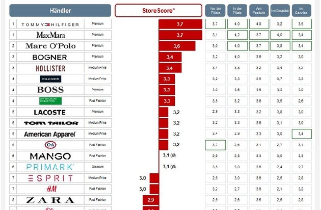 Max Mara und Tommy Hilfiger sind die Gewinner der Studie. Positiv fallen in den Filialen die gepflegten Räumlichkeiten, die großzügige Ausstattung und die hohe Mitarbeiterverfügbarkeit auf. Max Mara ist ein Best-Practice-Beispiel für Kundenorientierung: Mitarbeiter sprechen Kunden proaktiv an und nehmen sich Zeit für fachkompetente Beratung zu Trends, Stoffen, Farben und Modellen. Deutlich aufholen müssen dagegen Händler wie Tally Weijl oder New Yorker. Hier scheinen Ware und Nebentätigkeiten im Vordergrund zu stehen, nicht der Kunde. "Nur wer seine Filialprozesse konsequent auf den Kunden ausrichtet, hat eine Chance. Mitarbeiter müssen entlastet werden und aktiv verkaufen. Unser Ranking zeigt ganz klar auf, wo die Potenziale liegen. Jetzt gilt es, diese kosteneffizient zu heben, um Flächenproduktivität und Kundenerlebnis zu erhöhen", sagt Tobias Göbbel, Managing Partner und Retail Experte bei Batten & Company.