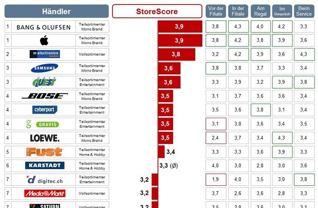 Apple und Bang & Olufsen sind die Gewinner der Studie. Bei Apple fällt vor allem die Konvertierungskraft der Filiale auf, während Bang & Olufsen mit seiner Produktpräsentation punktet. Beide Händler verfügen über eine hohe Mitarbeiterverfügbarkeit, kurze Wartezeiten und kompetente Beratung. Deutliche Optimierungspotenziale sind bei Interdiscount, Galeria Kaufhof und Euronics zu erkennen.