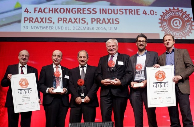 Auf dem 4. Fachkongress Industrie 4.0 wurden vier Unternehmen für ihre Industrie 4.0-Lösungen ausgezeichnet. Die ABB Stotz-Kontakt GmbH für 'Intelligente Automatisierung´, Klingelnberg Hückeswagen für 'Integration Design & Produktion', die Mangelberger Elektrotechnik GmbH, Roth, für 'IoT@KMU' und die SEW Eurodrive GmbH, Graben-Neudorf, für 'Lean & Industrie 4.0'.