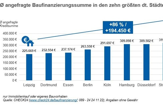 Mit deutlichem Abstand folgen im Ranking der zehn größten deutschen Städte Frankfurt am Main und Stuttgart. Am Ende des Top-Ten-Vergleichs landet - knapp hinter Dortmund und Essen - Leipzig mit einer durchschnittlich angefragten Baufinanzierungssumme von rund 226.000 Euro.