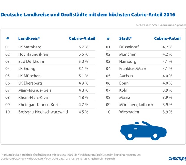79 Prozent BeitragDer Landkreis Starnberg ist Deutschlands Cabrio-Hochburg. Wie schon 2015 war dort auch im vergangenen Jahr der Anteil über CHECK24.de versicherter Cabriolets deutschlandweit am höchsten (5,7 Prozent). Im Vergleich der deutschen Großstädte landen Düsseldorf und München vorne mit jeweils 4,2 Prozent Cabrio-Anteil.*