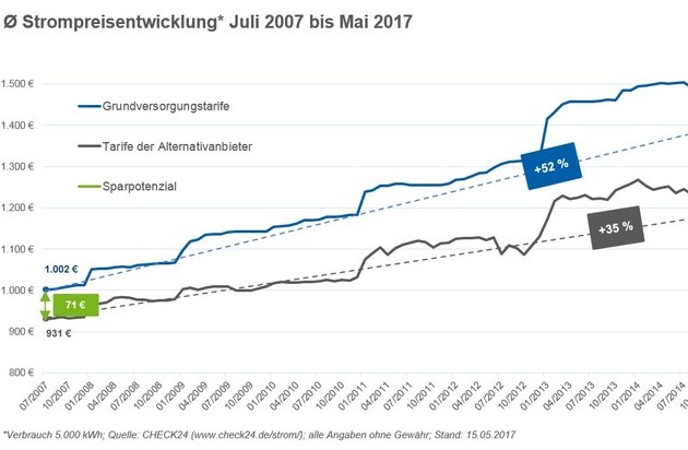 Im gleichen Zeitraum haben die Alternativanbieter ihre Preise um durchschnittlich 35 Prozent angehoben. Dennoch ist das Sparpotenzial durch einen Wechsel nach wie vor groß: Aktuell (Stand Mai 2017) zahlen Kunden der Alternativversorger für 5.000 kWh Strom 1.260 Euro - durchschnittlich 264 Euro weniger als in der Grundversorgung.*