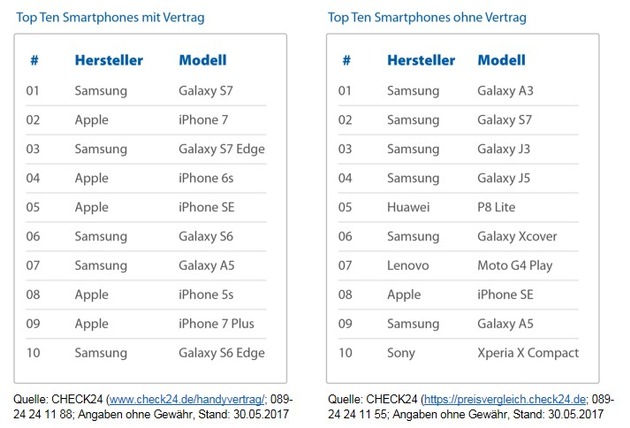 *)CHECK24.de hat alle zwischen Juni 2016 und Mai 2017 über das Vergleichsportal abgeschlossenen Mobilfunkverträge mit Smartphone betrachtet. Informationen zur Methodik und weitere Ergebnisse unter: http://ots.de/p2uZO