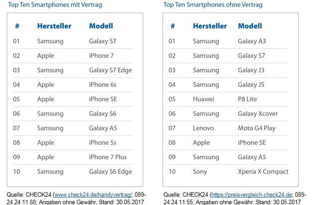 Die Top Ten Smartphones, die CHECK24-Kunden zum Handyvertrag wählen, sind verhältnismäßig teure Endgeräte von Samsung oder Apple. Ein möglicher Grund dafür: Neue, hochpreisige Smartphones werden oft mit einer monatlichen Ratenzahlung über den Mobilfunkvertrag finanziert. Dementsprechend sind die zehn über CHECK24.de meistgekauften Smartphones ohne Vertrag deutlich günstigere Modelle unterschiedlicher Hersteller. Samsung ist in beiden Rankings mit mehreren Modellen vertreten, Apple taucht dagegen in der Top Ten der Smartphones ohne Vertrag lediglich mit dem iPhone SE auf.