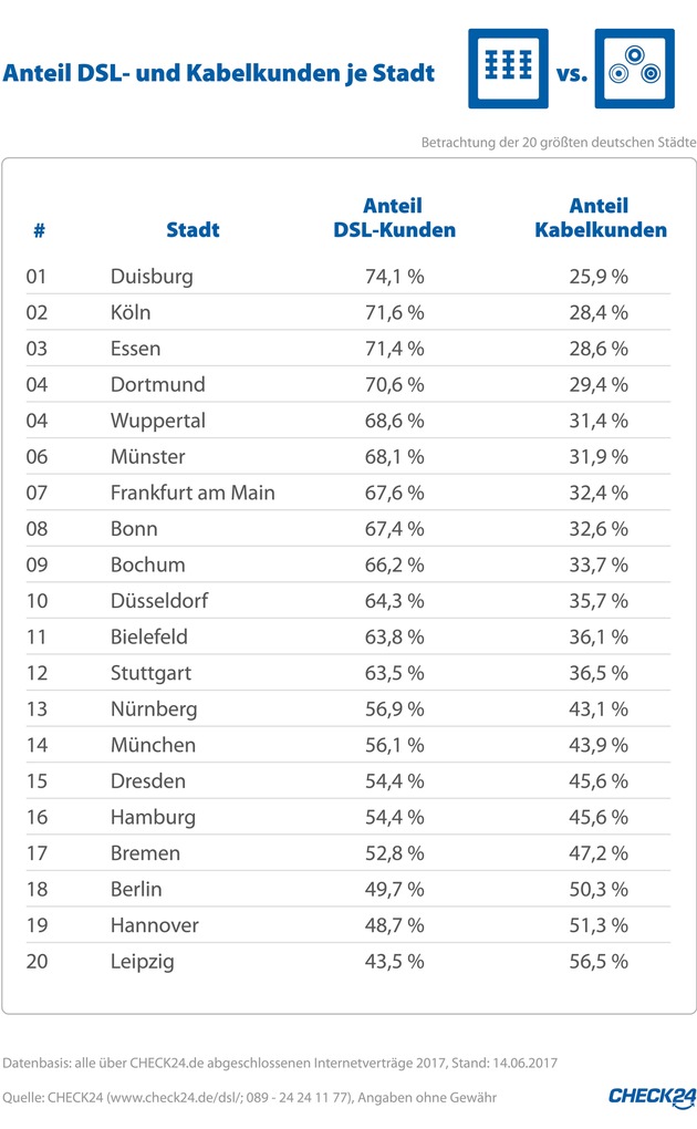 Im Vergleich der 20 einwohnerstärksten deutschen Städte hat Duisburg den größten Anteil an DSL-Kunden (74,1 Prozent). Auch auf den Plätzen dahinter folgen mit Köln, Essen, Dortmund und Münster Großstädte aus Nordrhein-Westfalen. Mehr Kabel- als DSL-Kunden gibt es in Berlin und Hannover, die meisten in Leipzig (56,5 Prozent).