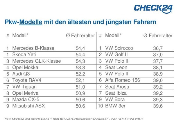 Die jüngste Klientel aller betrachteten Pkw-Modelle hat das VW-Sportcoupé Scirocco. Dessen Fahrer sind im Schnitt nur 36,7 Jahre alt und damit etwa 18 Jahre jünger als beispielsweise Fahrer einer B-Klasse. Unter den zehn Modellen mit den jüngsten Fahrern landen insgesamt acht von VW und Seat, darunter die Modelle Leon und Ibiza.