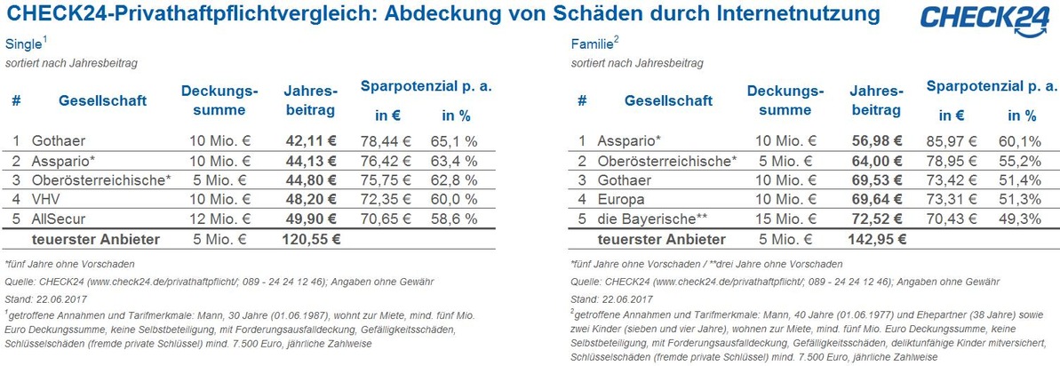 "Ältere Haftpflichtpolicen bieten häufig keinen Schutz bei Schäden durch Internetnutzung, moderne hingegen schon", sagt Dr. Rainer Klipp, Geschäftsführer im Bereich Privathaftpflichtversicherungen bei CHECK24.de. "Verbraucher sollten alle zwei bis vier Jahre über einen Wechsel nachdenken. Neue Tarife bieten umfassenderen Schutz, beinhalten mehr Extraleistungen und sind meist günstiger als ältere Verträge."