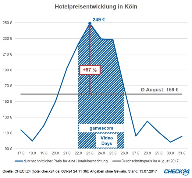 *)Allgemeine Suchkriterien: min. drei Sterne, min. sieben von zehn Punkte in der Kundenbewertung auf CHECK24.de, max. zwei Kilometer Luftlinie von der Messe Köln (Messeplatz 1, 50679 Köln) entfernt, Übernachtungszeitraum gamescom: Freitag, 25. bis Samstag, 26. August 2017, Vergleichszeitraum: Freitag, 18. bis Samstag, 19. August; Stand der Hotelpreise: 13. Juli 2017; alle in der Pressemeldung genannten Hotelpreise gelten pro Nacht im Doppelzimmer (ein Zimmer, zwei Erwachsene). Tabellen verfügbar unter: http://ots.de/yJF0x.