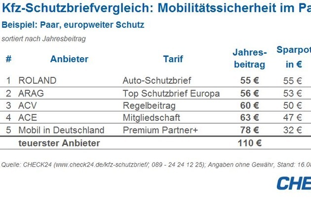 Der Anbietervergleich lohnt sich: Ein Paar, das sich für einen europaweiten Schutz entscheidet, spart im Beispiel bis zu 50 Prozent der Kosten. Die Absicherung kostet beim günstigsten Anbieter 55 Euro im Jahr, beim teuersten 110 Euro.