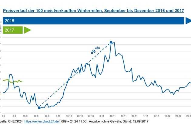 Autobesitzer, die noch Winterreifen benötigen, sollten frühzeitig kaufen. Ein Blick auf die Preisentwicklung im vergangenen Jahr zeigt: Ab Ende September ziehen die Preise für Winterreifen an. Bis Mitte November ist der durchschnittliche Preis der 100 über CHECK24.de meistverkauften Pneus im letzten Jahr um neun Prozent gestiegen. Aktuell liegt der Durchschnittspreis dieser Reifen leicht über dem Vorjahresniveau.