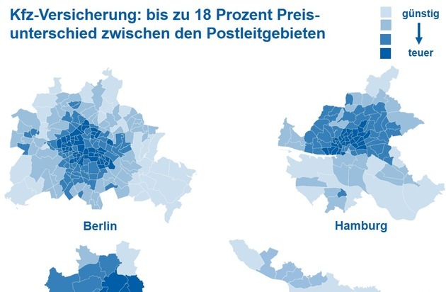 Je nach Postleitzahl variiert der Preis für eine Kfz-Versicherung innerhalb derselben Stadt um bis zu 18 Prozent - bei sonst identischen Vertragsangaben. In der Spitze unterscheidet sich der Jahresbeitrag zwischen dem günstigsten und dem teuersten Postleitgebiet einer Stadt um 170 Euro.*) Unter den 15 größten deutschen Städten variieren die Kfz-Versicherungsbeiträge in Berlin und Hamburg am stärksten. Dort liegen die maximalen Preisunterschiede für die berechneten Profile im zweistelligen Prozentbereich. Die geringsten Schwankungen gibt es in Stuttgart und Bremen.
