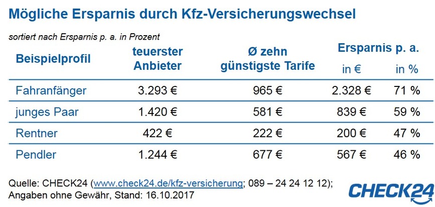 Ein Wechsel der Kfz-Versicherung lohnt sich in vielen Fällen. Das zeigen 15 exemplarische Berechnungen verschiedener Fahrerprofile von CHECK24.de.*) Ein junges Paar zahlt im Schnitt der zehn günstigsten Tarife 581 Euro jährlich, beim teuersten Anbieter werden 1.420 Euro fällig. Das entspricht einer möglichen Ersparnis von 839 Euro bzw. 59 Prozent.