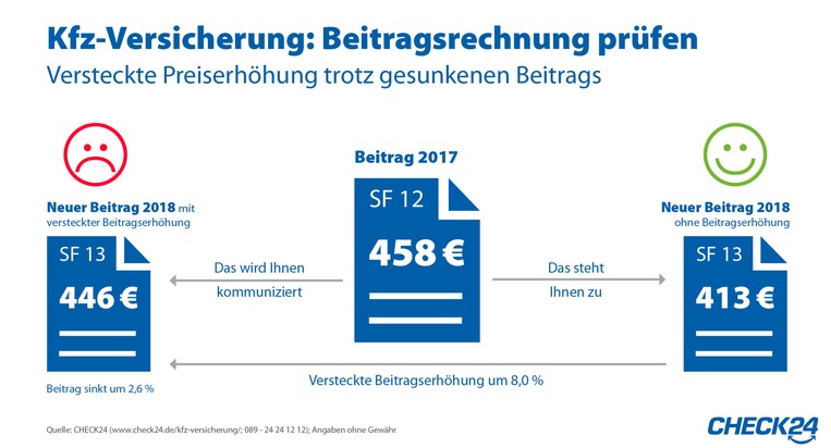 Beitragserhöhungen aufzudeckenKfz-Halter sollten die Beitragsrechnung ihrer Kfz-Versicherung für kommendes Jahr genau prüfen. Blieb der Versicherungsnehmer im abgelaufenen Jahr unfallfrei, verbessert sich 2018 seine Schadenfreiheitsklasse (SF-Klasse). Dadurch verringert sich der Versicherungsbeitrag. Versicherer können dadurch Preiserhöhungen leicht kaschieren.