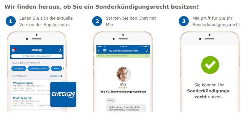 Die chatbasierte Kfz Sonderkündigungs-Assistentin ist in der CHECK24-App integriert und sowohl für iOS als auch Android verfügbar. Der Kunde klärt seine individuelle Situation mit "Mia" und kann ein Foto seiner Beitragsrechnung hochladen. Nach kurzer Zeit informiert "Mia" ihn dann darüber, ob der Vertrag außerordentlich gekündigt werden kann.