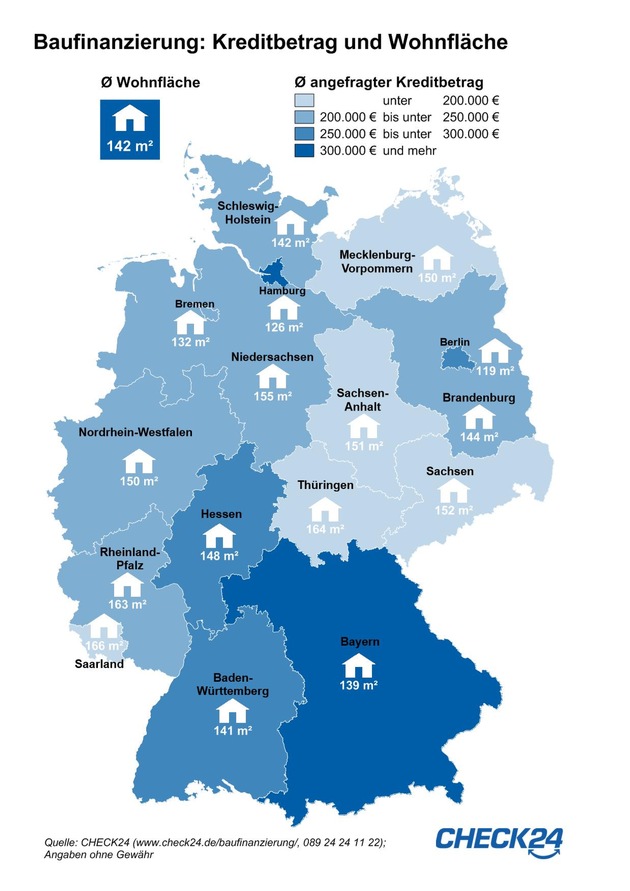 Im Bundeslandvergleich liegt Hamburg vorne: Die Hansestädter benötigen mit 333.000 Euro fast doppelt so hohe Darlehen für den Kauf oder Bau einer Immobilie wie CHECK24-Kunden aus Sachsen-Anhalt (Ø 170.000 Euro). Über dem Bundesdurchschnitt von 262.000 Euro liegen außerdem die Kreditsummen in Bayern, Baden-Württemberg, Berlin und Hessen.