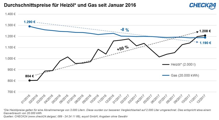 Während die Heizölpreise steigen, wird Gas immer günstiger. Seit Januar 2016 ist der CHECK24-Gaspreisindex um acht Prozent gesunken. Dadurch zahlen Verbraucher seit Jahresende 2017 für Gas wieder weniger als für Heizöl. 20.000 kWh Gas kosteten im Schnitt 1.190 Euro. Für die vergleichbare Menge an Heizöl waren 1.208 Euro fällig.